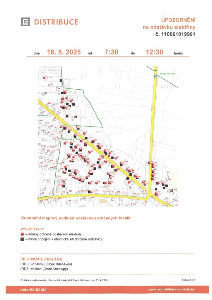 Odstávka elektřiny dne 16.5.2025